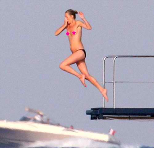 Υποτίθεται ότι το ταξίδι του μέλιτος έχει τελειώσει για την Kate Moss, αλλά εκείνη συνεχίζει τις διακοπές της από μέρος σε μέρος...Το υπερπολυτελές γιοτ, με το οποίο ταξιδεύει η Moss έκανε στάση στο St Tropez, για να απολαύσει τον ηλιόλουστο καιρό και τη θάλασσα κάνοντας... τόπλες βουτιές!Δεν είναι βέβαια η πρώτη φορά που ο φακός των παπαράτσι την έχει συλλάβει να κολυμπά μόνο με το κάτω μέρος του μαγιό της, αφού το συνηθίζει!